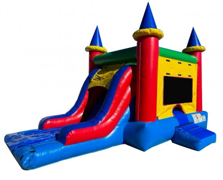 Our Party Palace Combo is a perfect fit for any backyard party! This moonwalk has a jumping area with basketball hoop and a climb and slide attached.